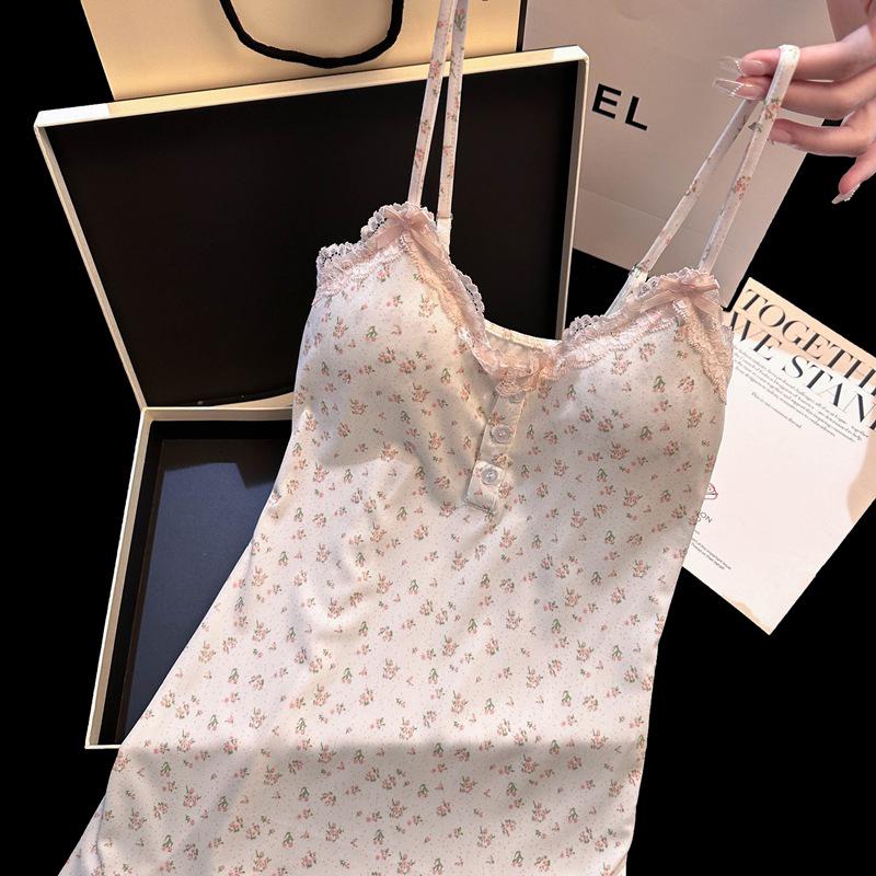 Gönnen Sie sich Komfort und Stil mit diesem bezaubernden Nachthemd mit Blumendruck und zarter Spitzenpatchwork.. Hergestellt aus weichem Polyestermaterial, bietet es ein sanftes Gefühl auf der Haut.. Ärmellos für eine entspannte Passform, mit Brustpolstern für zusätzlichen Halt und Komfort. Perfekt für einen gemütlichen und verführerischen Schlaf.