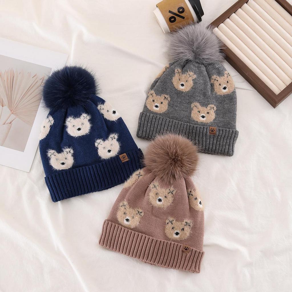 Niedliche, fleecegefütterte Bommel-Bärenmütze für Kinder – kuscheliges Strickaccessoire für den Winter