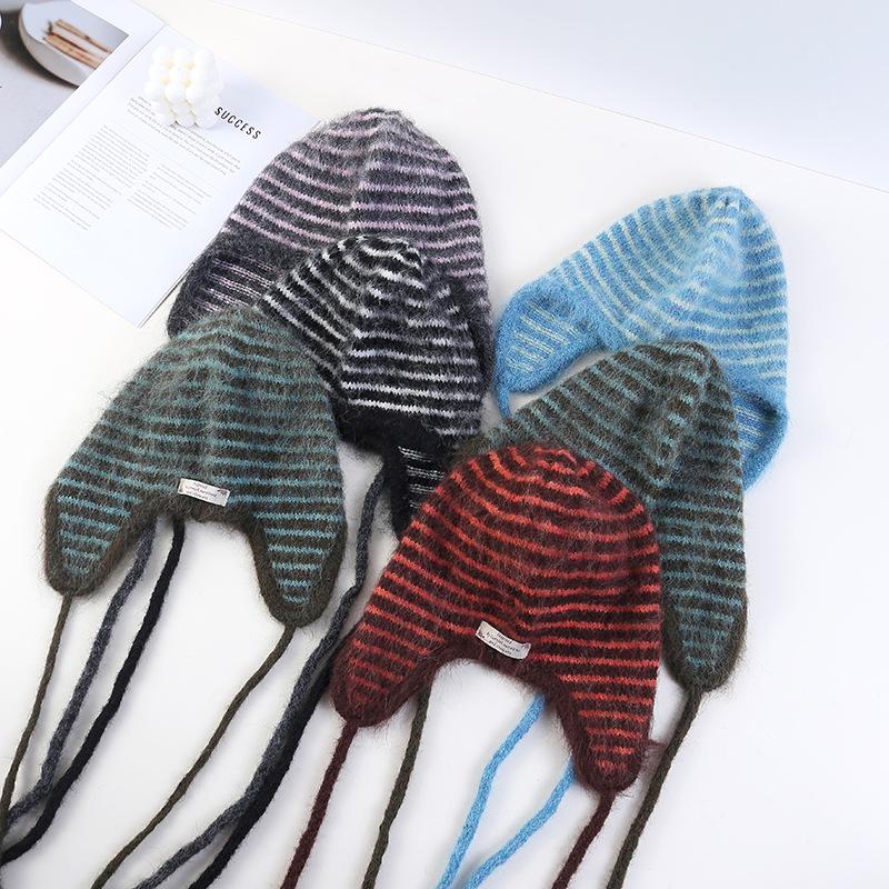Retro Koreanischer Stil Mohair Gestreifte Strick Ohrenklappenmütze für Damen - Niedlich und Warm für Herbst/Winter