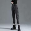 Hochtaillierte Cropped Jeans für Damen Lockere Passform mit Plüsch und Verdickter Haremjeans