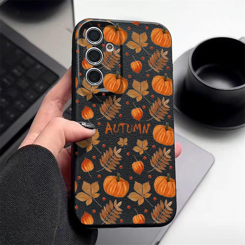 Herbst Kürbisdruck Handyhülle Für Samsung Galaxy S25 Edge S24 S25 FE S23 S22 Ultra A17 A56 A55 A54 A36 A15 A16 Silikon Ledertextur Cover