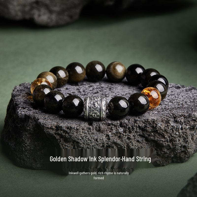 Herren High-End Retro Chinesischer Stil Armband: 999 Sterlingsilber mit natürlichem goldenem Obsidian und gelben Turmkristallperlen