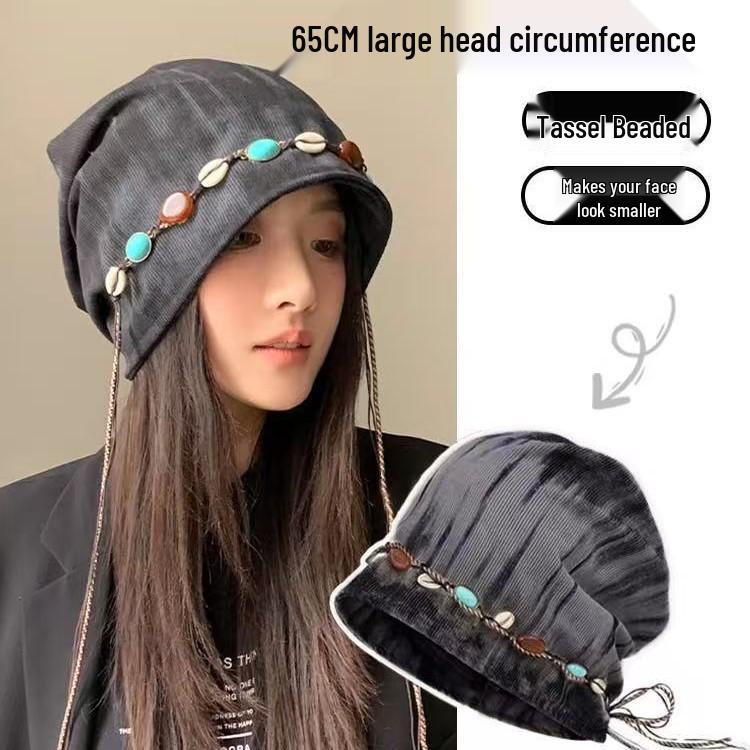 Korean-Style Tie-Dye Beaded Slouchy Beanie for Women - Ethnic Retro Tassel Skull Cap, Early Autumn Wear