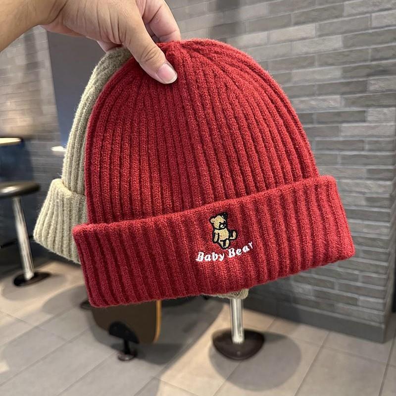 Autumn and Winter Warm and Thick Knitted Hat for Women Cute Bear Letter Embroidered Pullover Hat Versatile for Street Youth