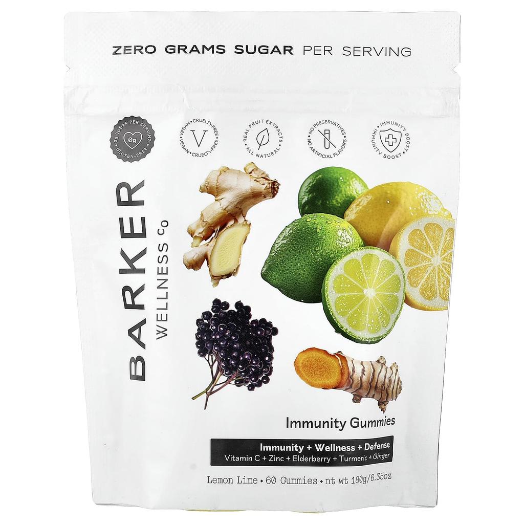 Product Description: 0g Sugars Per Serving, Gluten-Free, Vegan, Cruelty-Free, Real Fruit Extract, 100% Natural Ingredients, No Preservatives, No Artificial Flavors, Immune Boost, Wellness + Defense, Vitamin C, Zinc, Elderberry, Turmeric, and Ginger. These vegan and sugar-free Lemon Lime-flavored Immunity Gummies are formulated to strengthen your body's natural defenses and promote overall health. These delicious gummies are packed with powerful immune-boosting ingredients like Vitamin C and Zinc, along with antioxidant-rich Black Elderberry and the natural healing properties of Turmeric and Ginger. Taking these daily gummies to help maintain health and vitality is a convenient way to boost your immune system. Vitamin C is an essential nutrient that plays a role in overall wellness and immune support. Zinc is essential for immune cell development and function and plays a crucial role in maintaining a healthy immune response. Black Elderberry: These berries are rich in immune-boosting antioxidants and vitamins, known to help fight inflammation and infection. Ginger is a natural anti-inflammatory that aids digestion, reduces nausea, and strengthens the immune system. Turmeric is a root traditionally used for its antioxidant properties and overall well-being.