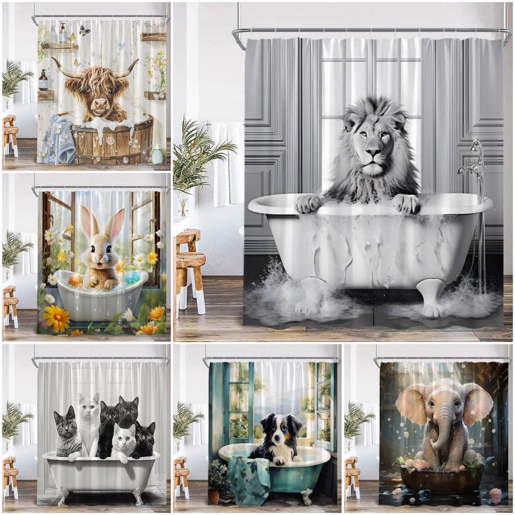 Lustige Tiere Baden Duschvorhänge Hochlandrind Schweine Kaninchen Hunde Badewanne Badezimmer Dekor Polyester Duschvorhänge mit Haken