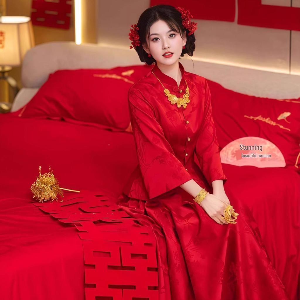 Dieses exquisite zweiteilige Kleidset ist perfekt für Hochzeits- und Verlobungszeremonien und besticht durch eine atemberaubende rote Farbe, die traditionelle Eleganz verkörpert.. Das Kleid ist aus hochwertigem Polyester gefertigt und bietet ein luxuriöses Tragegefühl und hervorragenden Komfort.. Das Oberteil ist mit einem Stehkragen gestaltet und hat 3/4- oder 7/10-Ärmel, was einen raffinierten und anspruchsvollen Look verleiht.. Die Mischung aus modernem Design und klassischen Elementen macht dieses Set zu einer perfekten Wahl für diejenigen, die kulturelle Schönheit mit zeitgenössischem Stil verbinden möchten.