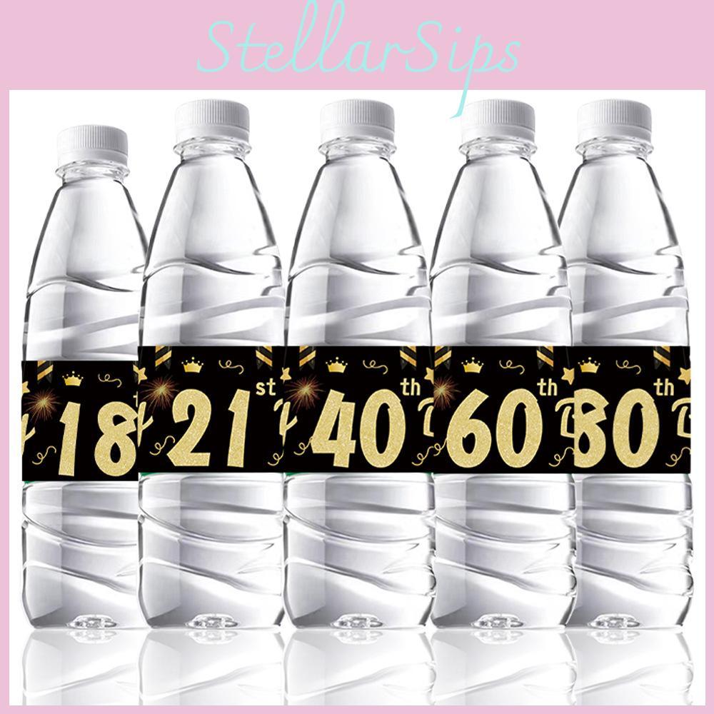 Dieses Set von Flaschenetiketten im Schwarz- und Gold-Thema wurde entworfen, um die Partydekoration mit einer stilvollen Note aufzuwerten.. Hergestellt aus strapazierfähigem Papier, misst jedes Etikett passend für Standard-Mineralwasserflaschen und bietet Größen für die Altersgruppen 18, 21, 30, 40, 50, 60, 70 und 80 Jahre.. Das 24-teilige Set unterstützt eine nahtlose Veranstaltungsdekoration, ideal für Meilenstein-Feiern und Themenpartys.. Diese Etiketten sind einfach anzubringen und zu entfernen und können zur Wiederverwendung oder für Ausbesserungen mit einem feuchten Tuch abgewischt werden.