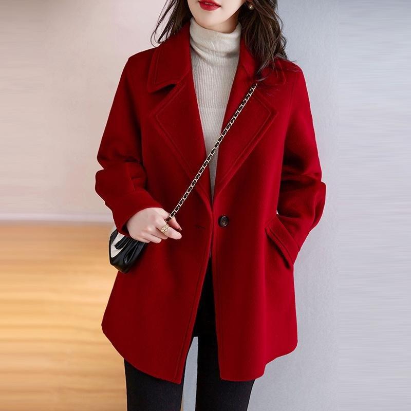Damen Roter Wollmantel Koreanischer Stil Lockere Passform Vintage Mode Blazer Revers Winterjacke