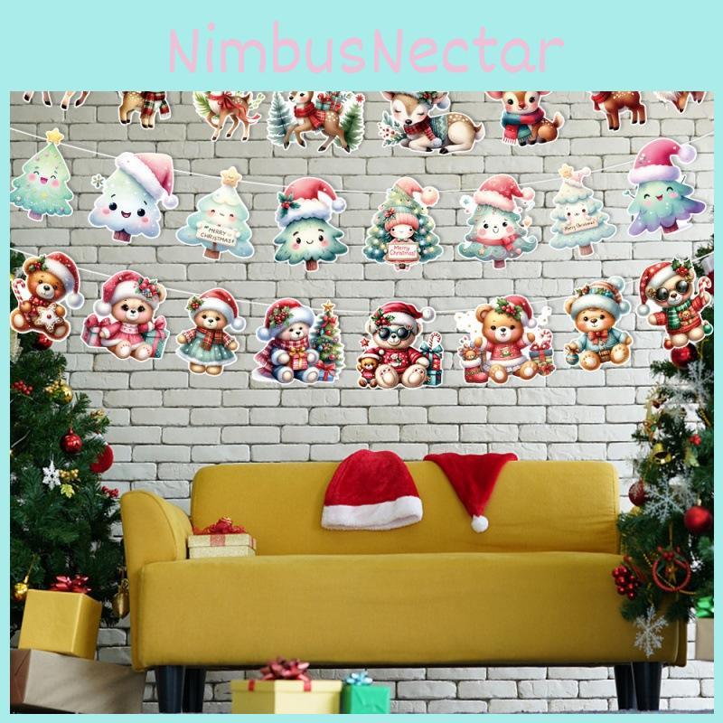 This Christmas-themed banner set features paper-based decorative flags, including reindeer, Christmas trees, bears, snowmen, and Santa Claus. Each flag measures approximately 16*16.6cm, designed for vibrant visual impact. with included ribbons and pins for easy DIY assembly. Suitable for seasonal celebrations and festive occasions, these banners can be reused with gentle maintenance. Wipe clean with a dry cloth to preserve their colorful appearance.