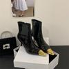 Miting kurze Stiefel Lackleder Metall spitz schwarz dünne Stiefel Damen Herbst und Winter neu hochhackig Temperament kurze Stiefel Damen