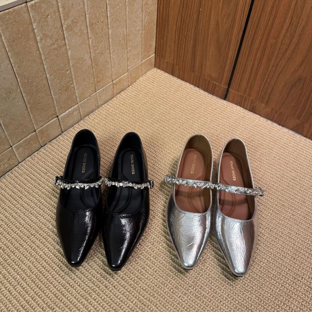 2025 neue spitze Ein-Wort-Schuhe mit Strassnieten, innen abgeschrägter Absatz, flacher Ausschnitt, vielseitige Pendler-Arbeitsschuhe für Damen