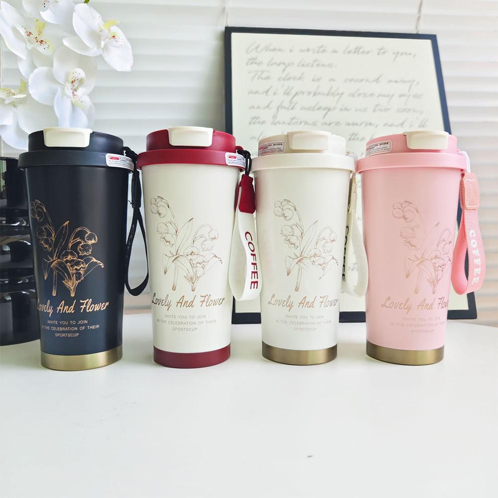 Maiglöckchen Edelstahl Isolierkaffeetasse - Großes Fassungsvermögen, Tragbar, mit Strohhalm für Draußen