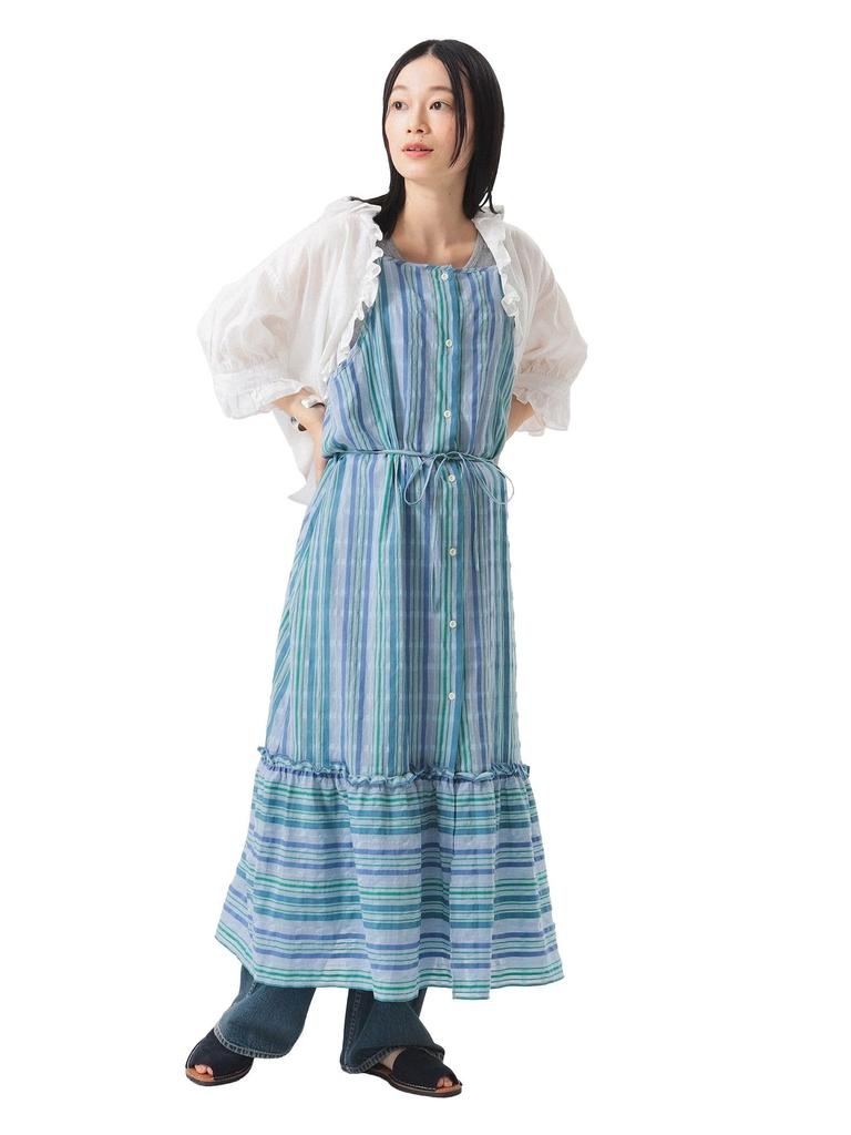 This new design is based on last year's popular camisole-style dress. The stripes create a refreshing impression. The shoulder straps are narrow for a delicate look, and the dress can be worn either front or back.