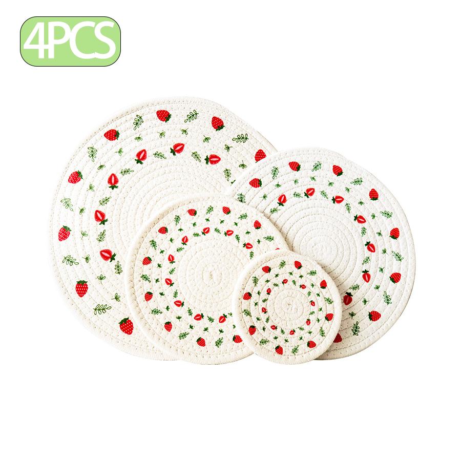 ### Produktbeschreibung Dieses runde Stoff-Platzset und Untersetzer-Set mit Erdbeerdruck (4 Stück) mit einem frischen und entzückenden Erdbeermuster. Hergestellt aus hochwertigem Stoff, ist es dick, langlebig und bietet hervorragende Wärmeisolierung und Rutschfestigkeit.. Das Set enthält **4 runde Untersetzer mit unterschiedlichem Durchmesser** (12cm, 18cm, 24cm, 30cm), welche als Untersetzer, Schüsseluntersetzer, Platzsets und Topfuntersetzer verwendet werden können und die Schutz- und Dekorationsbedürfnisse verschiedener Alltagsgeschirre erfüllen. Die Verarbeitung ist exquisit, mit feinem Faden, der die Mitte sichert, und mehreren verstärkten Nähten, was sie robust, langlebig und lockerungsbeständig macht.. Das Material ist elastisch und kehrt nach Druck leicht in seine ursprüngliche Form zurück.. Es kann direkt mit Wasser gewaschen oder bei Verschmutzung sanft mit einer weichen Bürste abgebürstet werden und ist wiederverwendbar. (Vermeiden Sie längere Sonneneinstrahlung, um Vergilbung und Ausbleichen zu verhindern.). Der Gesamtstil tendiert zu einem frischen, ländlichen Gefühl und verleiht dem Tisch für Frühstücksplattierungen, Nachmittagstee-Arrangements oder alltägliche Mahlzeiten eine lebendige, fruchtige Note.. Es dient sowohl als praktische wärmeisolierende und schützende Unterlage als auch als dekoratives Element, das die Ästhetik Ihres Esstisches aufwertet.