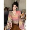Retro Gradient V-Ausschnitt Strickpullover - Damen Locker Langarm Pullover für Herbst/Winter 2025
