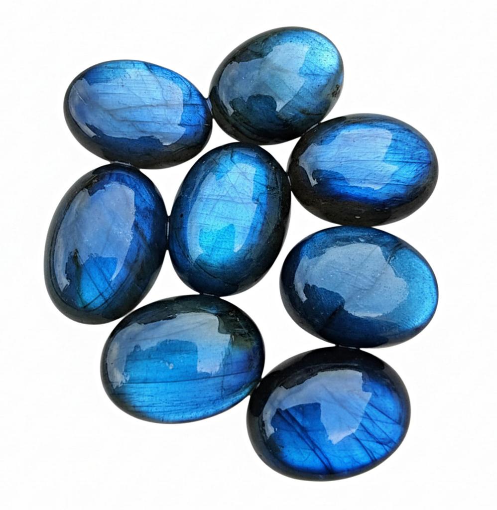 These AAA Quality Labradorite Oval Cabochon Gemstones showcase an exceptional High Flash Blue phenomenon, known as labradorescence. Each stone is meticulously cut into a smooth oval cabochon shape, designed to maximize the brilliant internal blue "fire" that shimmers and shifts with movement. Available in all sizes, these top-grade gems are highly sought after by jewelers for creating stunning, eye-catching rings, pendants, and earrings. Their superior quality ensures maximum polish, excellent clarity, and vibrant color-play for truly mesmerizing finished pieces.