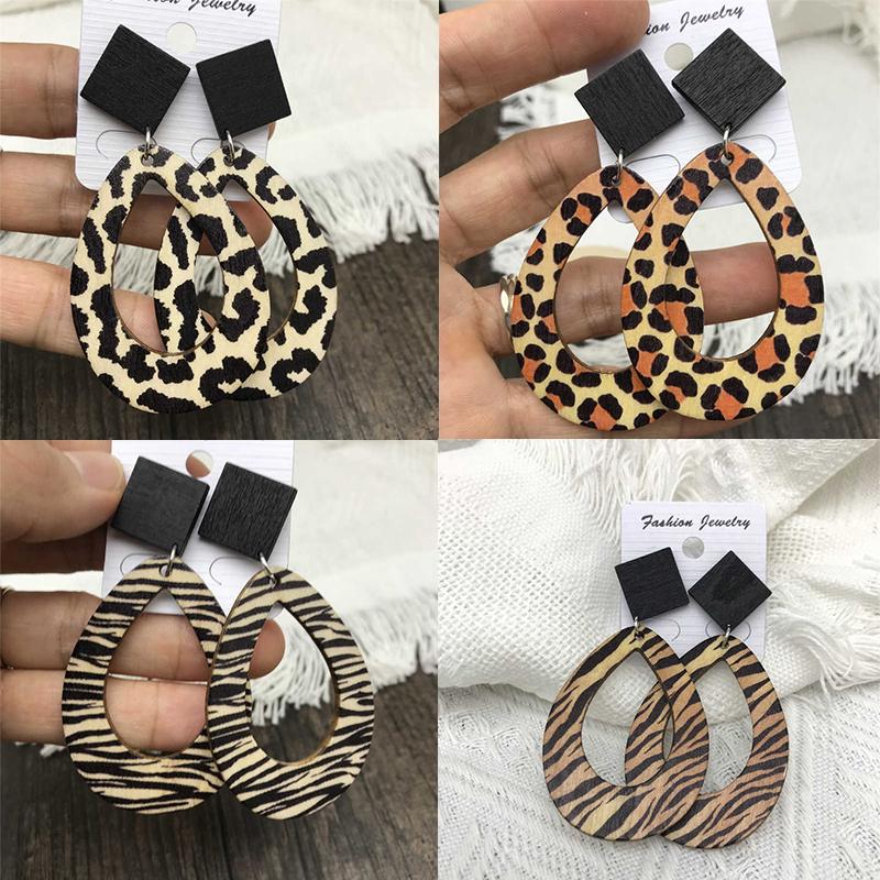 Wooden Earrings Leopard Zebra Pattern Raindrops Dangle Vintage Bohemian Style