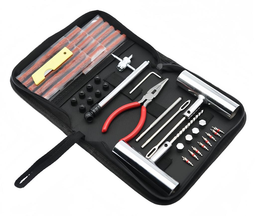 Reifendichtgummi x 15, T-Haken x 1, T-förmige Ahle x 1, Ersatz x 1, Ahle x 1, Inbusschlüssel x 1, Zange x 1, Ventileinsatzwerkzeug x 1, Ventileinsatz x 8, Metallventilkappen x 4, Kunststoffventilkappen x 8, Reifendruckmesser x 1, x 1, Spezieller Aufbewahrungskoffer x 1