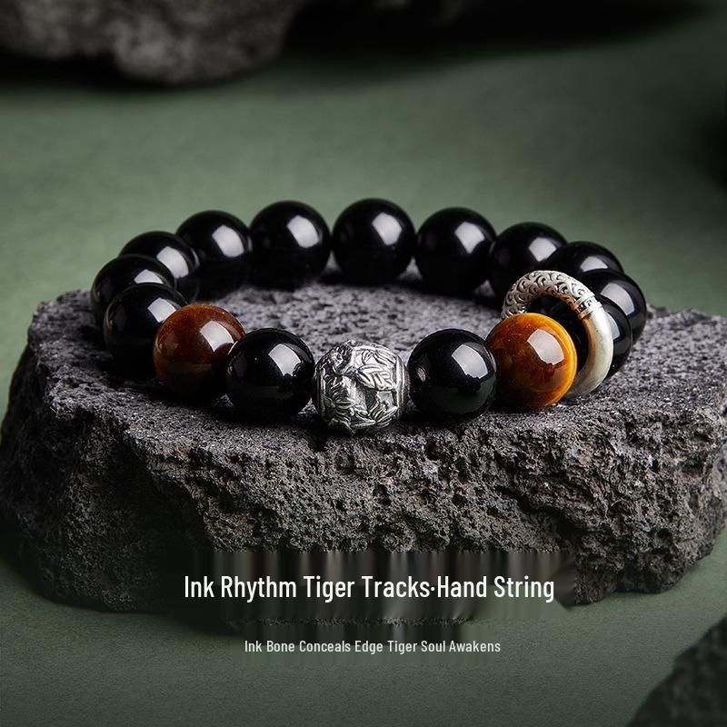 Min Yue S925 Sterlingsilber Sicherheitsverschluss Herren Obsidian & Goldener Tigerauge Perlen Retro Armband - Hochwertiges Geschenk für Freund