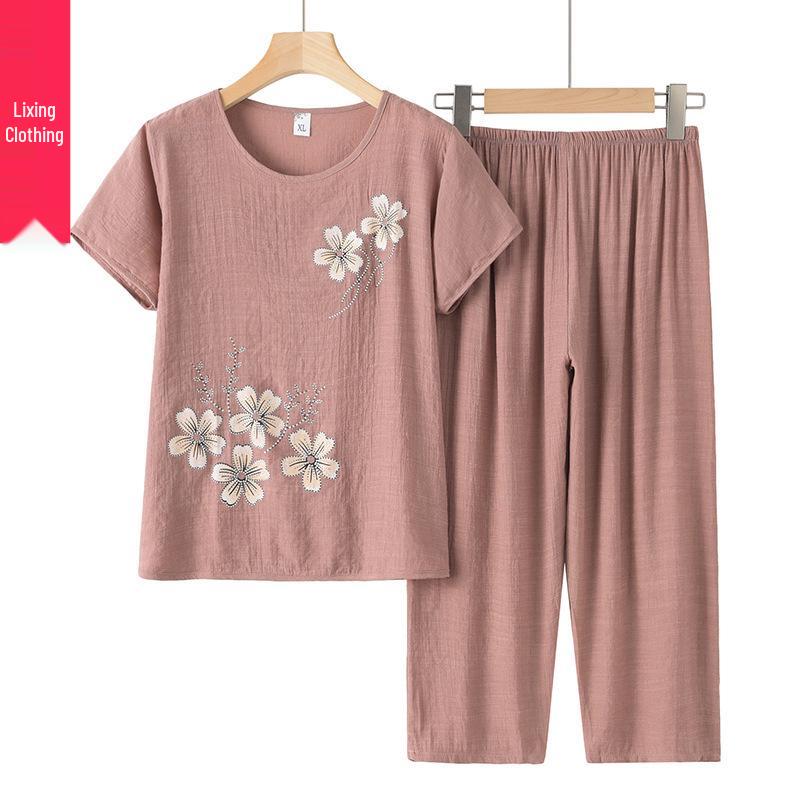 Omas Sommer Baumwollleinen Zweiteiler Kurzarm Outfit für ältere Frauen