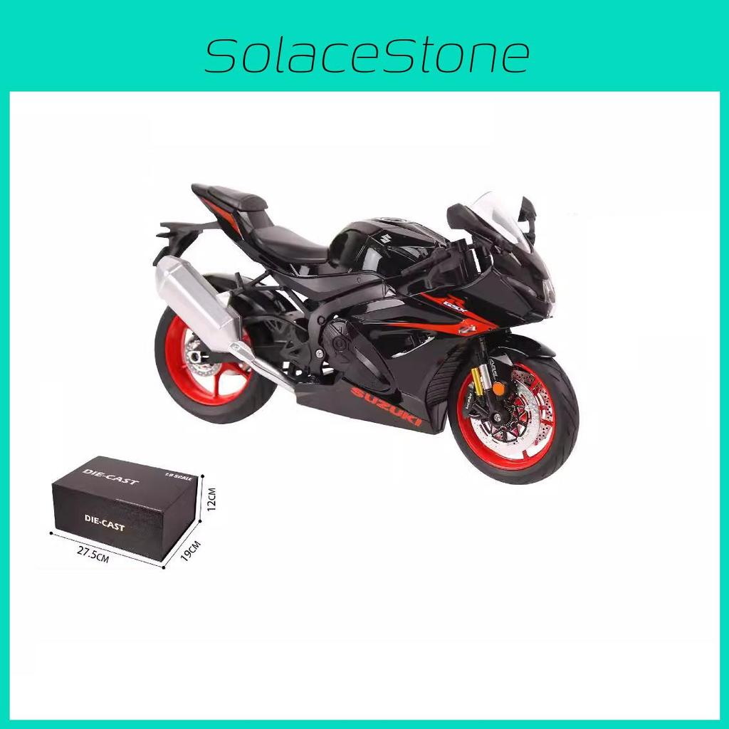 This 1:9 scale motorcycle model depicts the Suzuki GSX-R1000R with precision-crafted alloy construction, It features inertia control for smooth rolling and is designed as a static collectible. Ideal for display or motorcycle enthusiasts, it requires no maintenance beyond dusting.