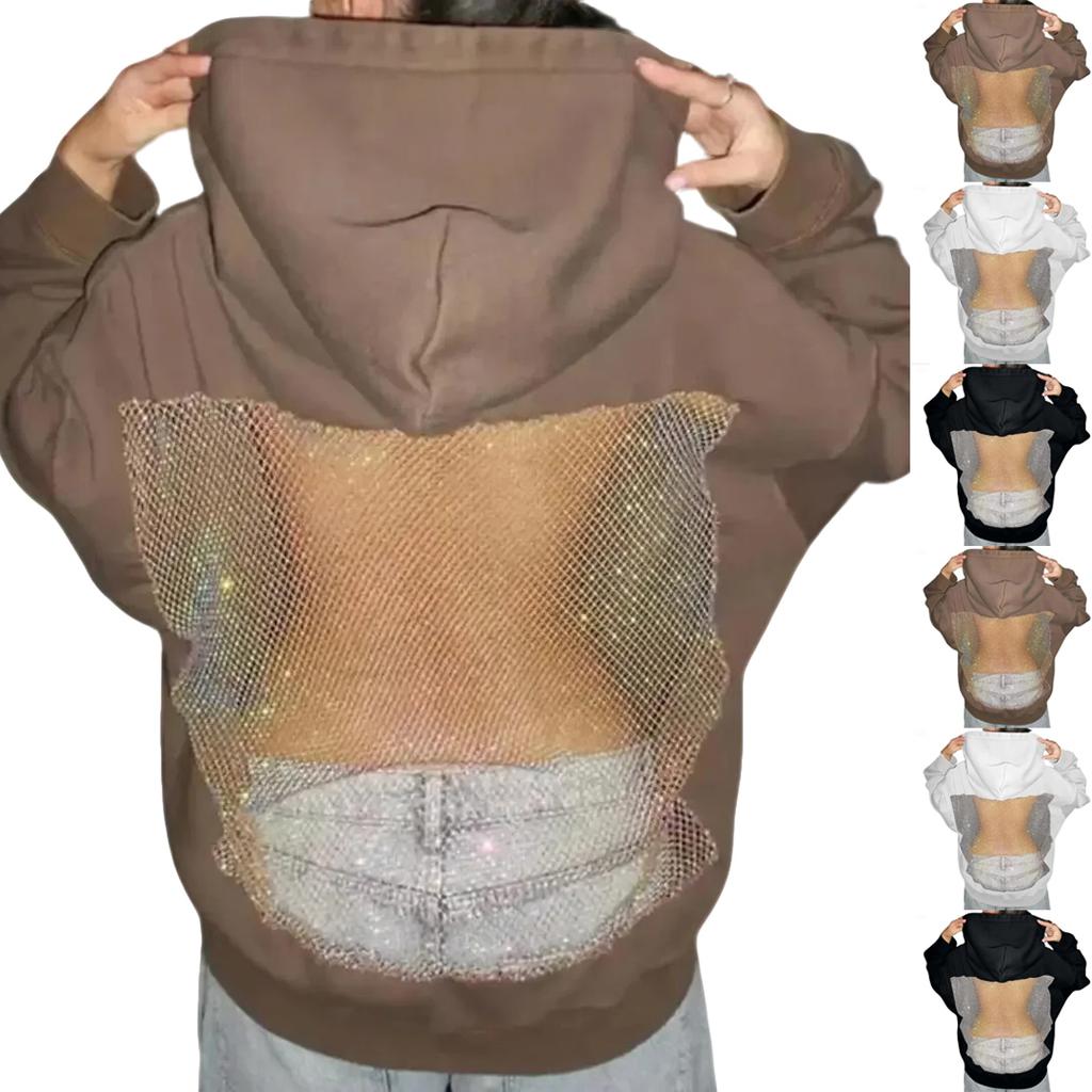 Damen Einfarbiges Modisches Rückenfreies Hollow Mesh Langarm Kapuzensweatshirt