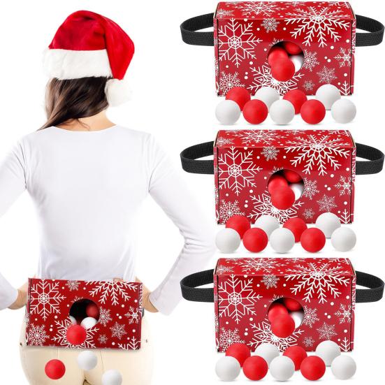 Die festliche, rot mit weißen Schneeflocken verzierte Schachtel trägt zur weihnachtlichen Atmosphäre bei.. Einfach zu spielen, hängen Sie die Box einfach auf, füllen Sie sie mit Bällen und wetteifern Sie darum, sie zuerst auszuschütteln.