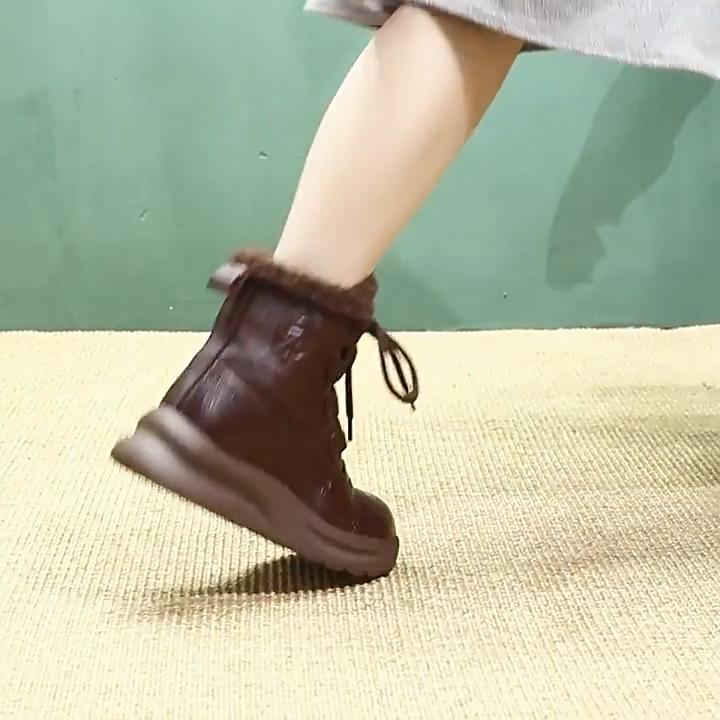 Johnature Kurzstiefel mit dicker Sohle Retro Echtes Leder Plüsch Warm Runde Zehenpartie Schnürschuhe Damen