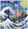 Lustiger Dinosaurier und Katze in Japanischen Kanagawa-Wellen Duschvorhang Wasserdichter Stoff Urkomischer Badezimmervorhang mit 12 Haken