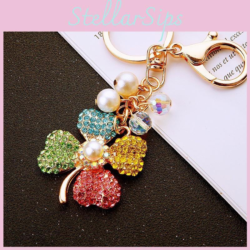 Crafted with a beautiful combination of pearls and sparkling crystals, this keychain is not just a practical item; its a symbol of luck and prosperity, making it a meaningful keepsake for anyone who receives it.Designed in a chic Korean style, the Four Leaf Clover Keychain is available in a delightful array of colors, including enchanting green, vibrant multicolor, soft pink, and classic white, with an option for a surprise color!