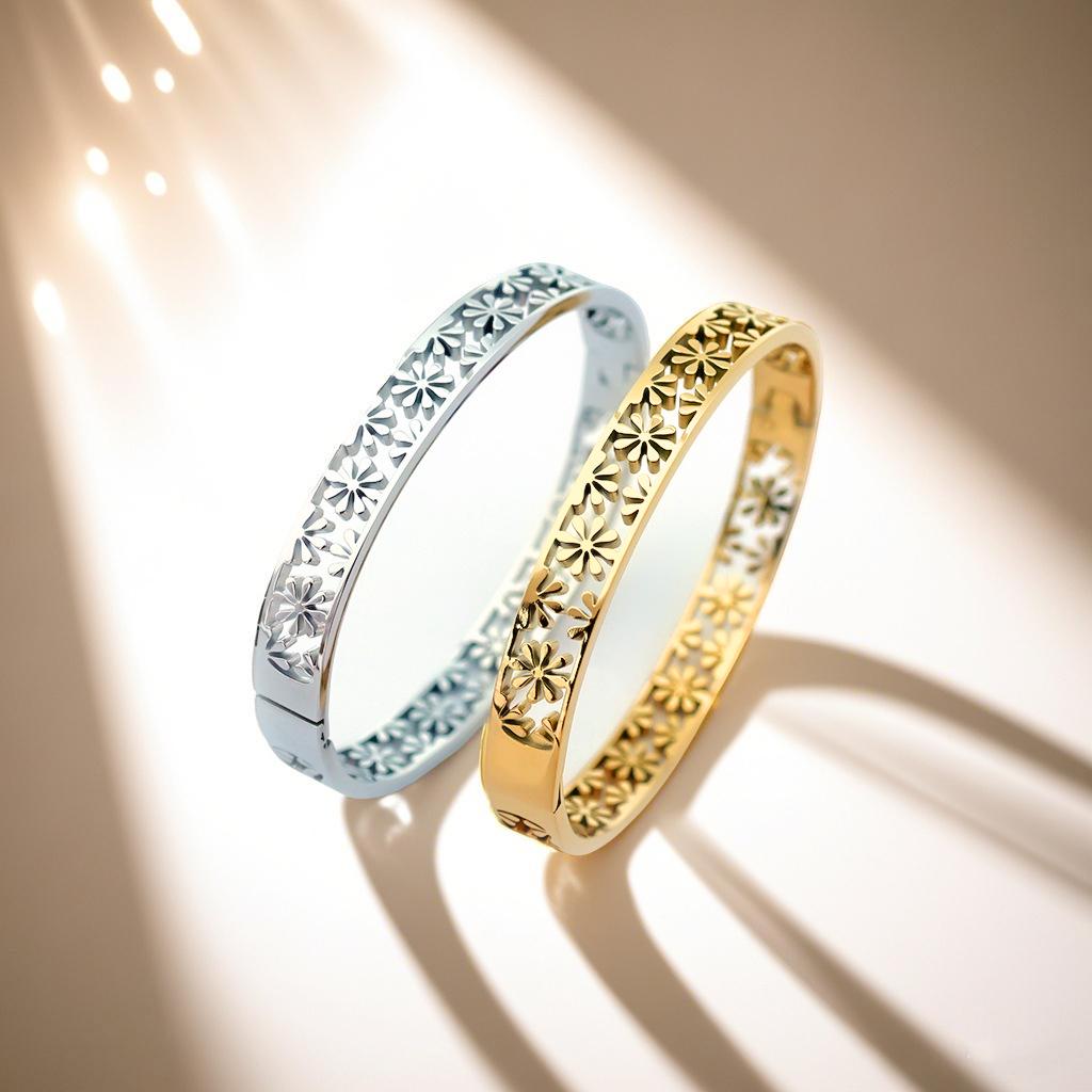 Edelstahl Schneeflocken Armreif: Weihnachten und Neujahr Offener Armreif aus Silber oder vergoldetem Titanstahl.