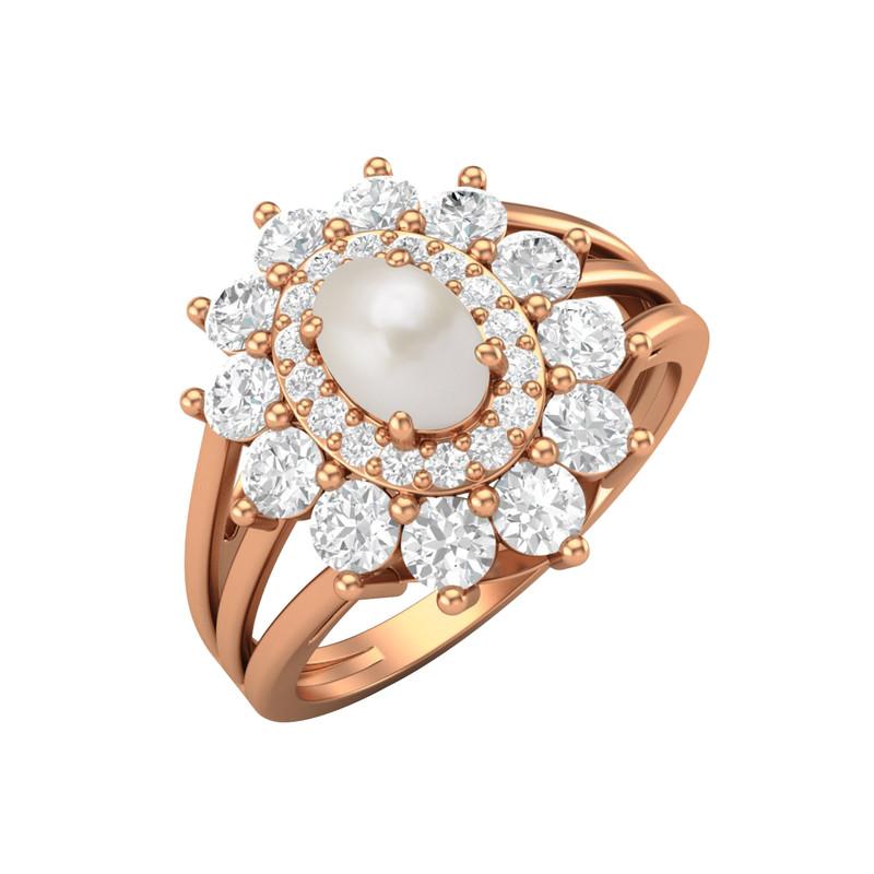 6X4MM Oval Pearl Gemstone 925 Sterling Silver Rose Plated Halo Split Shank Ring