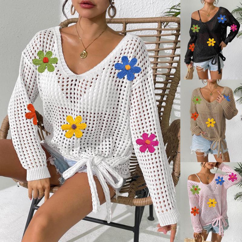 Women's V-neck Pullover Top Hollow Blouse with Bow Tie Woolen Outer Layer Knitted Sweater Spliced Loose