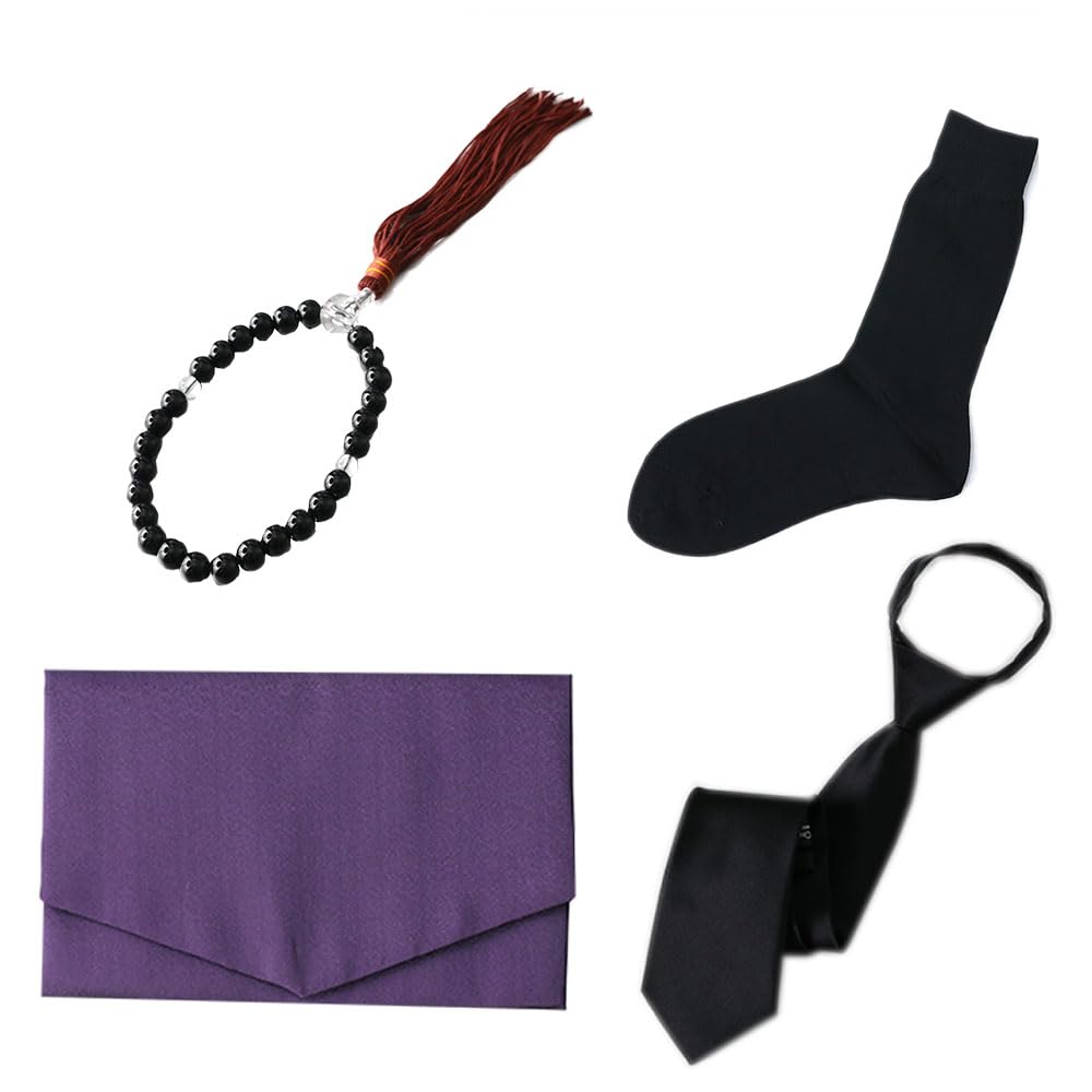 [Dress Code 101] 4-Piece Set of Socks [Funeral Set with Choice of Tie] Black Tie, Purple Fukusa Cloth, Prayer Beads, Men's Zipper Tie, Standard Size,