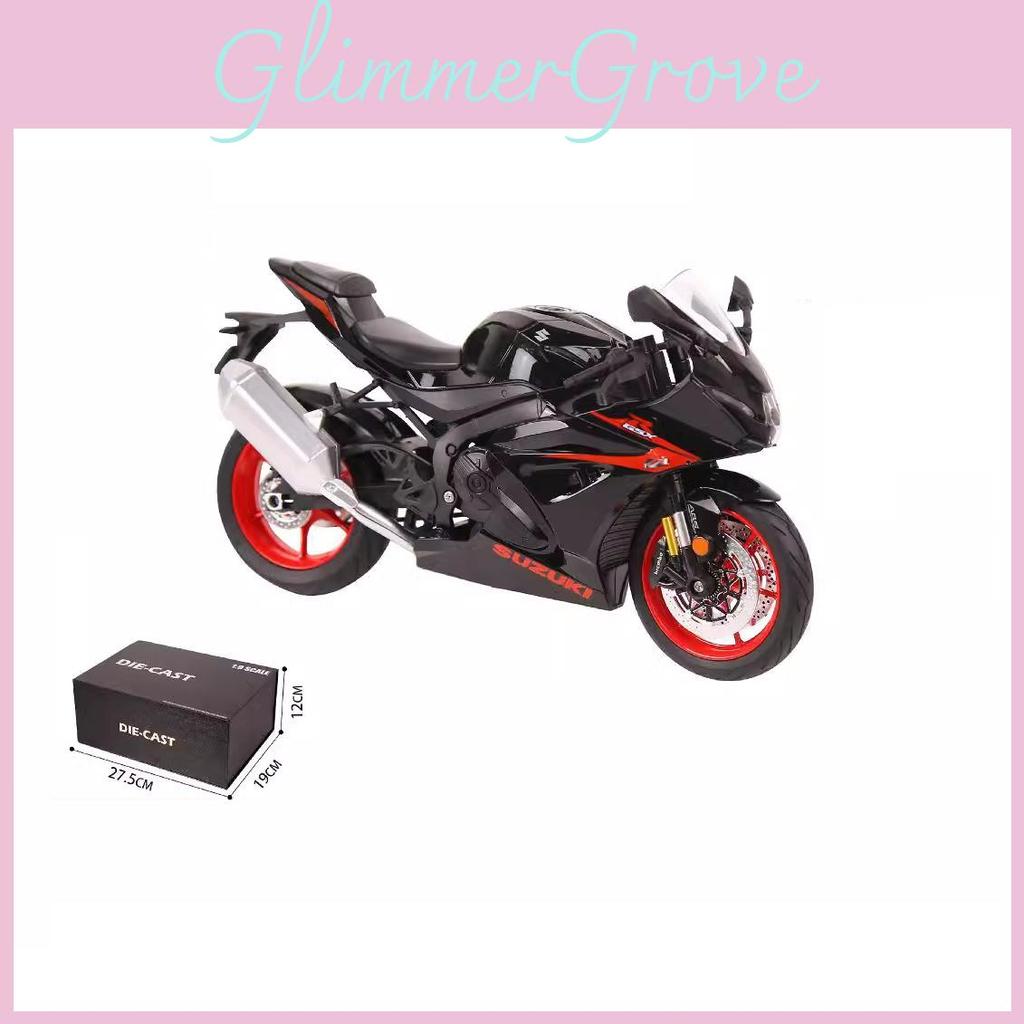 This 1:9 scale motorcycle model depicts the Suzuki GSX-R1000R with precision-crafted alloy construction, It features inertia control for smooth rolling and is designed as a static collectible. Ideal for display or motorcycle enthusiasts, it requires no maintenance beyond dusting.