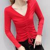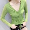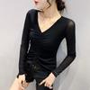 Sexy Fashion Mesh Solid Color T-shirt for Female Spring Autumn New Temperament V-Neck Shirring Slim Tops Women's Clothing