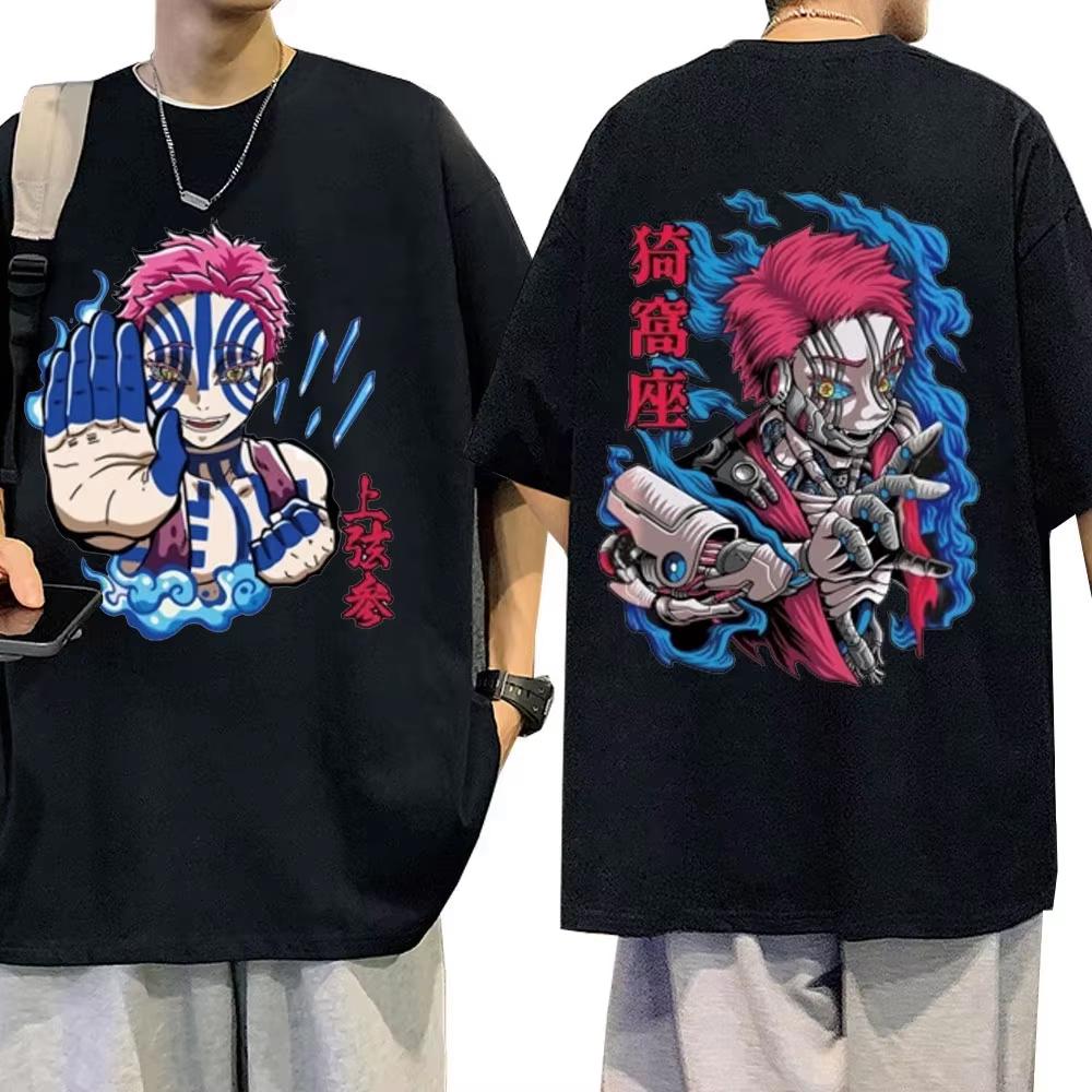Anime Demon Slayer Akaza Doppelseitiger Druck T-Shirt Männer Frauen Kleidung Cartoon Übergroßes T-Shirt Männlich Lässig Weiche Baumwoll-T-Shirts