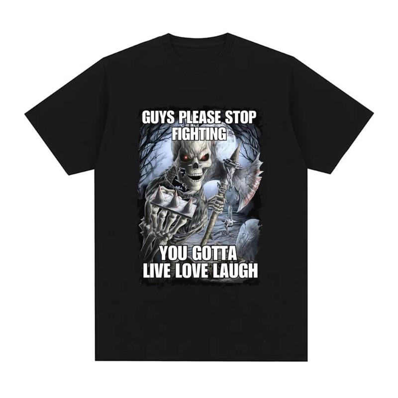 Mode Jungs Bitte Hört Auf zu Kämpfen Ihr Müsst Leben Lieben Lachen Skelett Meme Grafik T-Shirt Frauen Vintage Kurzarm T-Shirts
