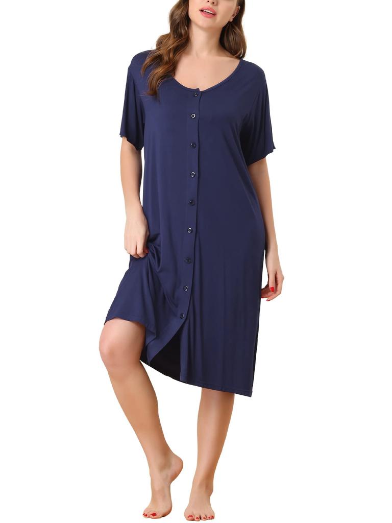 With a round neck, short sleeves, solid color, button-down and midi length, this lounge dress will keep you comfortable all night long.