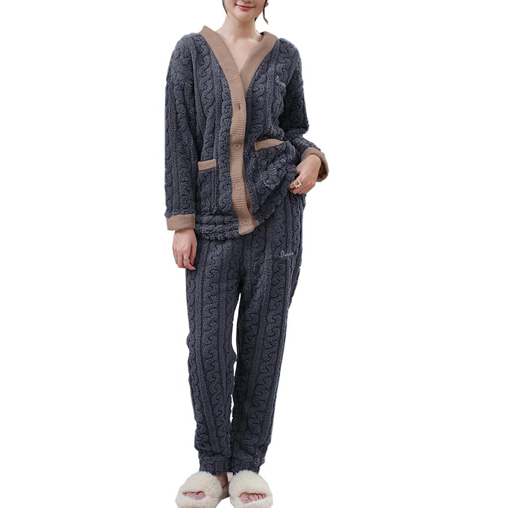 [Warme und liebliche Damen-Loungewear] Wir stellen ein neues Loungewear-Ober- und Unterteilset vor, perfekt zum Entspannen zu Hause. Das geprägte Material erzeugt ein dreidimensionales Muster. Der offene V-Ausschnitt und die Knöpfe am Oberteil erleichtern das An- und Ausziehen.. Taschen auf beiden Seiten des Oberteils erhöhen seine Funktionalität. Besonders auffällig ist das „Bumped Color Design“, ein Stil, der clevere Farbkombinationen verwendet.. Dieses weiche und flauschige Ober- und Unterteil-Set wird Sie sanft in Komfort hüllen.. Dieser niedliche Loungewear-Stil ist perfekt für die Freizeit am Wochenende, mit einer bequemen Passform und perfekt für einen lässigen Ausflug.