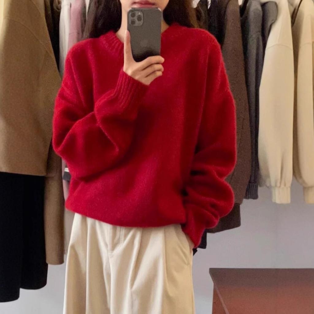 Red raccoon velvet crew neck pullover sweater women's autumn and winter senior sense lazy wind loose knitted sweater top
