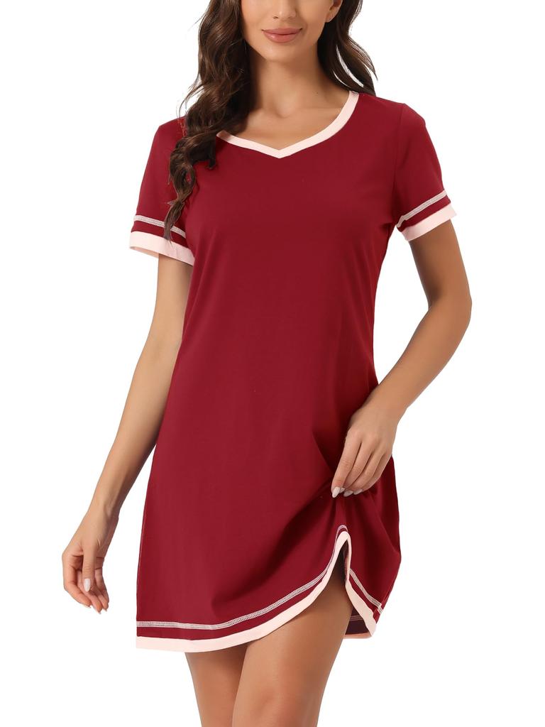 This basic sleep dress offers a casual and comfortable feel, features a pullover V-neck, above-knee length and is made from soft fabric: 60% polyester, 35% cotton and 5% spandex.
