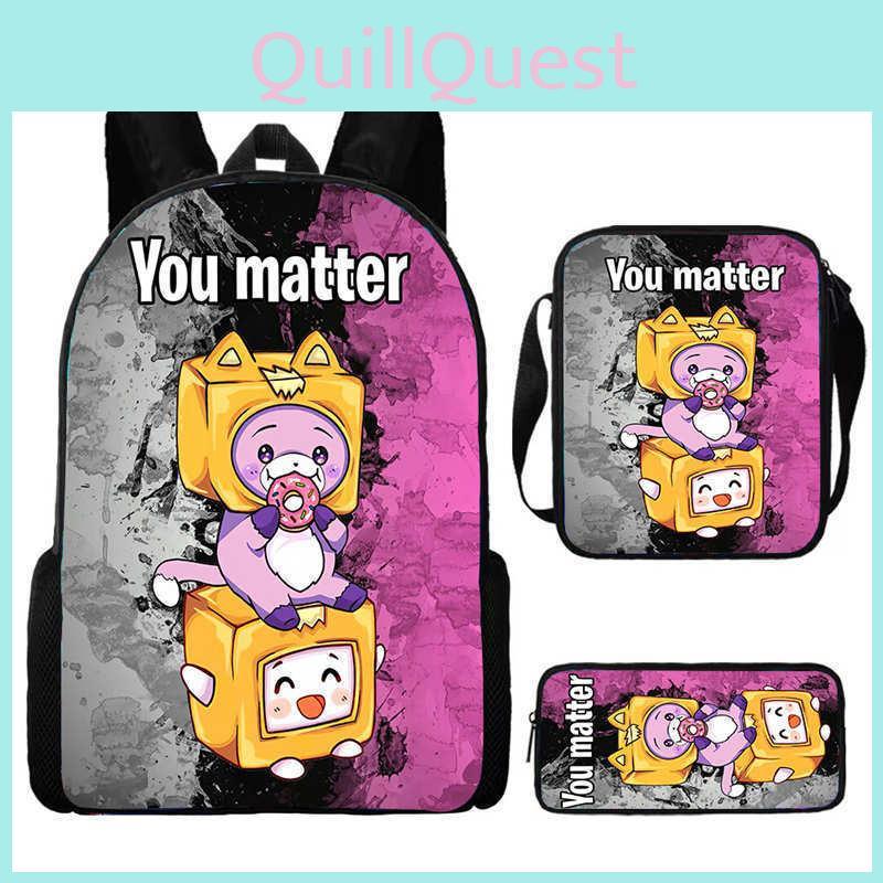 This Lankybox-themed school backpack set features a lightweight oxford fabric design with breathable, cushioned straps for comfortable daily use. The set includes a spacious backpack, a convenient shoulder bag, and a pen case, all adorned with colorful cartoon prints. Ideal for elementary students, it supports ample storage and easy organization. Wipe clean with a damp cloth for maintenance.