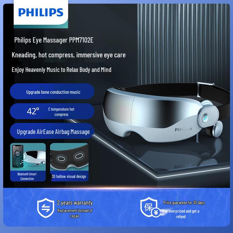 Indulge in soothing eye relief with the Philips PPM7102E Smart Eye Massager. This advanced eye mask combines gentle airbag compression with a comforting warm compress to alleviate eye strain and dryness. Featuring integrated bone conduction technology, it allows you to enjoy music while relaxing. The foldable design, Type-C charging, and four-gear intensity adjustment make it ideal for home, office, or travel use, ensuring a personalized and rejuvenating experience.