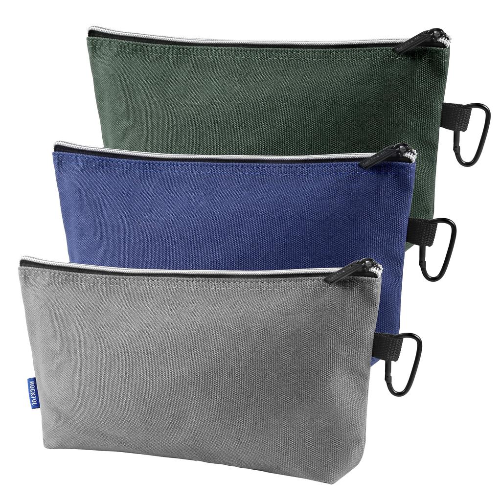 ROCKTOL Premium Canvas Zipper Tool Bag Set - A dependable organizational solution for a variety of purposes. Made with durable 16oz canvas and reinforced double-ply material, these bags are built to last. They offer spacious storage with a flat bottom, and conveniently fold and roll up when not in use. This tool bag set comes in three colors: gray, green, and blue, making sorting and organization easy. Use them to store and organize tools, gadgets, stationery, cosmetics, toiletries, travel accessories, and more.