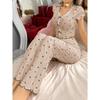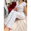 Pyjama-Set mit Herz-Print, geripptem Rüschenbesatz, Nachtwäsche für Damen, gestricktes V-Ausschnitt, lockere Oberteile, elastische lange Hosen
