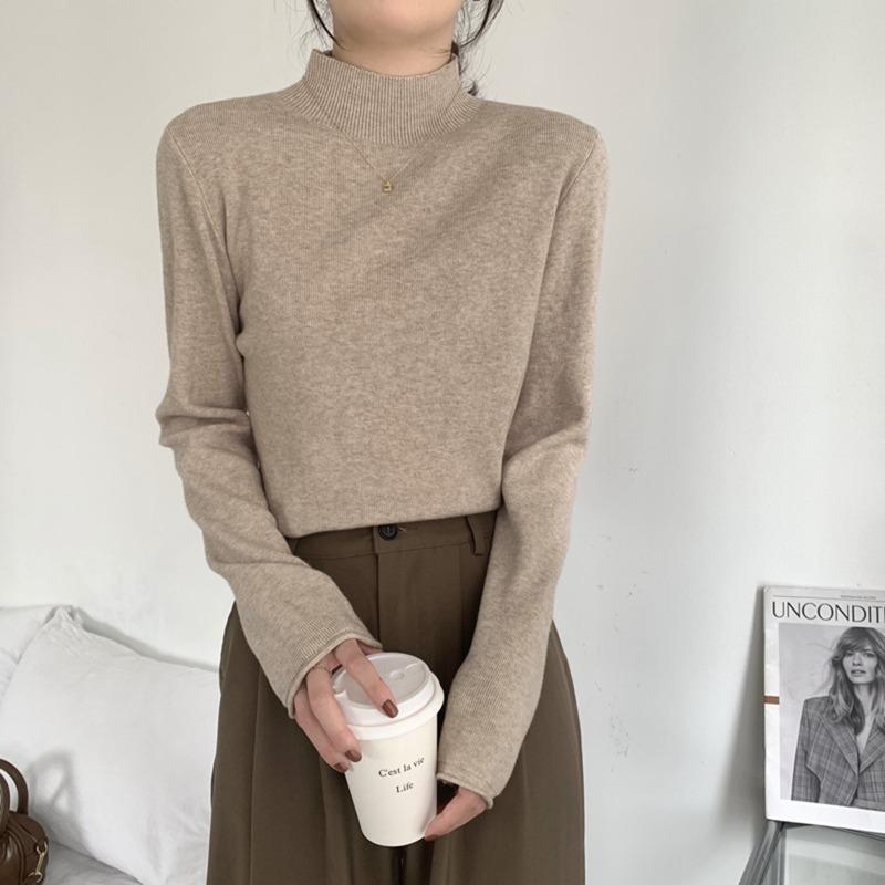 Semi-turtleneck camel knitted sweater women's spring relaxation simple long-sleeved inner top base