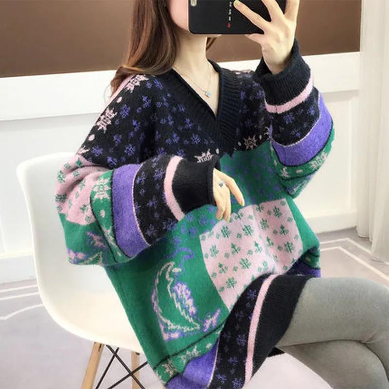 Sweater for Women Winter Oversize Stretchy Thickened Pullover Warm Knitted Striped V Neck Long Sleeve Jumper Tops