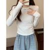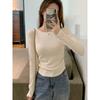 Simple slim-fitting and thin T-shirt top, spring pleated card waist long-sleeved women's inner bottoming shirt